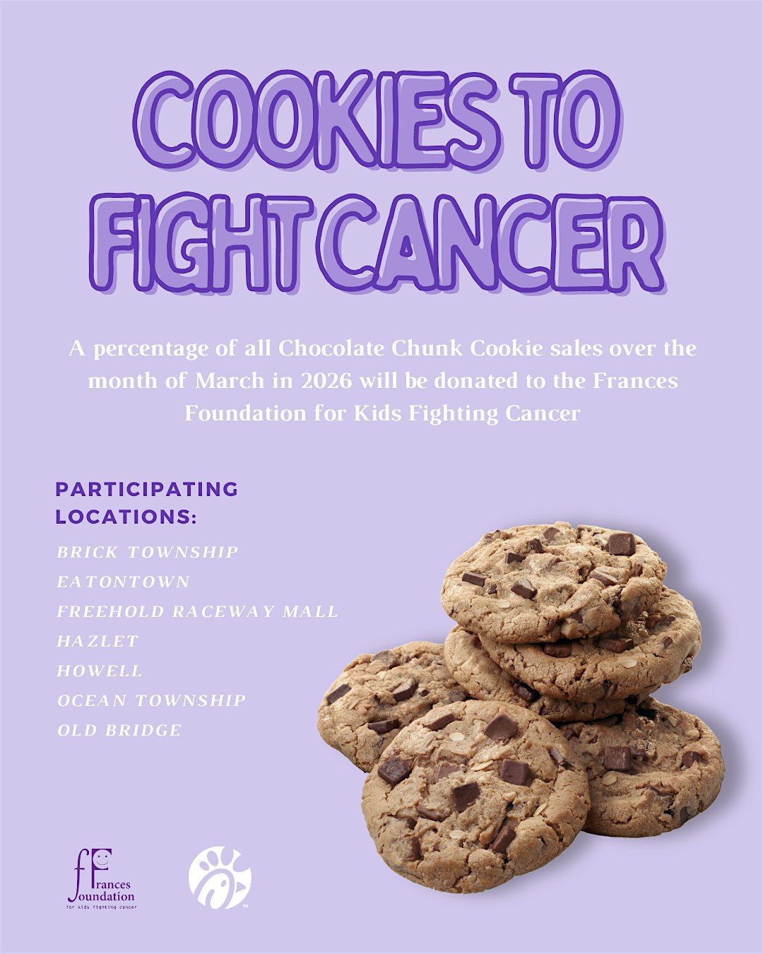 Throughout the whole month of March, we will be donating a portion of all cookie sales to the Francis Foundation for Kids Fighting. Join us for bingo to learn more about the foundation, help support the cause, and have lots of fun!