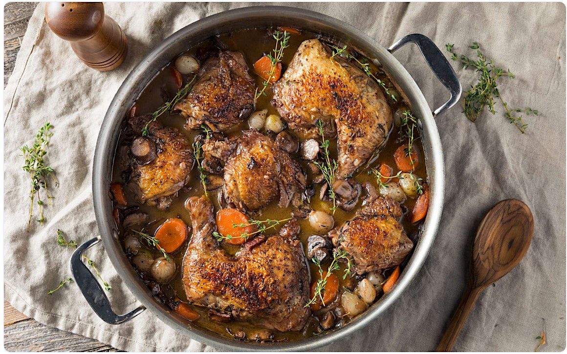 - Coq au Vin : Savor the perfection of this beautifully classic French delicacy featuring tender chicken simmered in rich red wine sauce with crispy bacon.