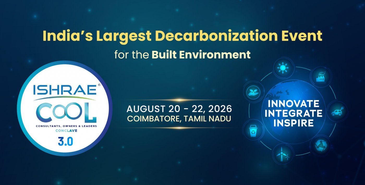 ISHRAE is pleased to announce the Cool Conclave 2026, which will take place from Coimbatore. The event, with the theme “Decarbonization”, will bring together leading professionals from the building and HVACR industries, including real estate developers, architects, consultants, contractors, manufacturers, policymakers, and other key stakeholders. This conference will address critical issues and solutions regarding sustainability, with a strong focus on decarbonizing the built environment.