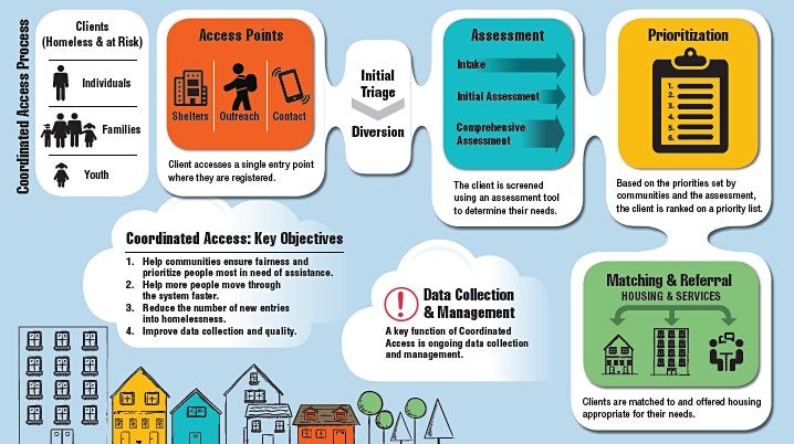 Coordinated Access requires more collaboration among community in order to better serve individuals and families at-risk of or currently experiencing homelessness. This is done by agreeing to standardized community-wide policies and procedures related to access to service, intake and assessment, prioritization, and referral and matching clients to programs and services.