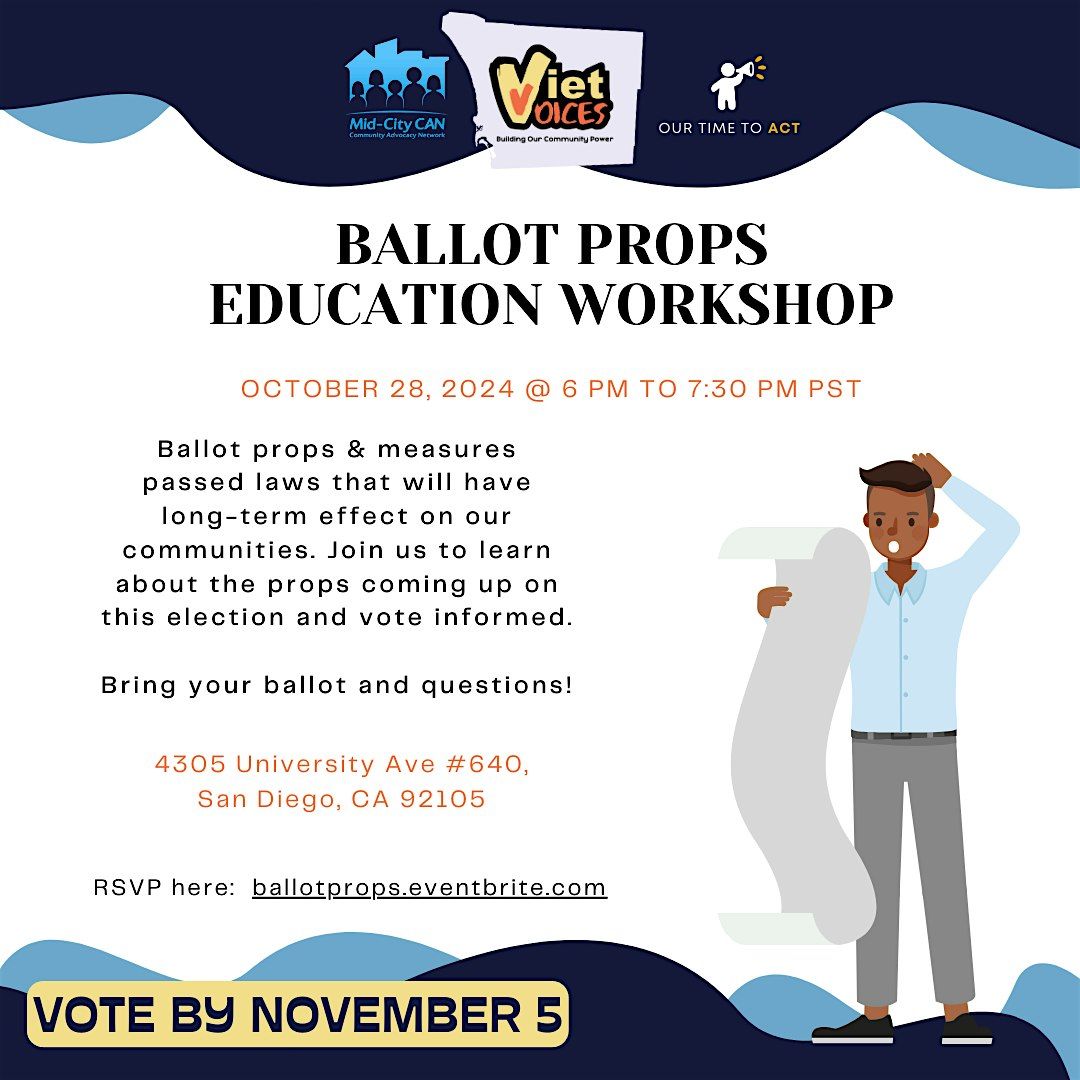 Welcome to the Ballot Props Education Workshop! Join the Viet Voices, in collaboration with OTTA United and Mid-City Can, team for an evening of learning and discussion about the upcoming ballot propositions. This event will take place on Monday, Oct 28, 2024 at 6:00 PM. Get informed about the issues and make your voice heard. Don't miss out on this opportunity to become a more informed voter!