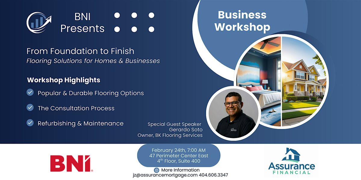 Join us for an exclusive BNI workshop this Tuesday: "From Foundation to Finish: Flooring Solutions for Homes and Businesses" 🏠🏢 Discover how to choose the right flooring for every space—from cozy living rooms to high-traffic commercial zones. Whether you're a homeowner, property manager, or interior designer, this session is packed with value:
