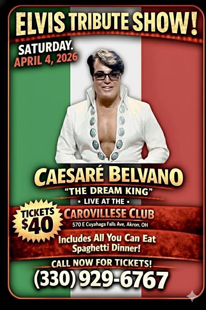 ---------------------------------------------------------------------------He is The Dream King. Caesare Belvano is an American actor, singer, lookalike, and singing tribute actor to Legendary Elvis Presley.Caesare is regarded as the ‘Ultimate Elvis Tribute Artist.The Sun Never Sets On A Legend!Dinner from 5-6:30 | Elvis from 7-9 | Meet & Greet 9-10$40 a Person gets you: