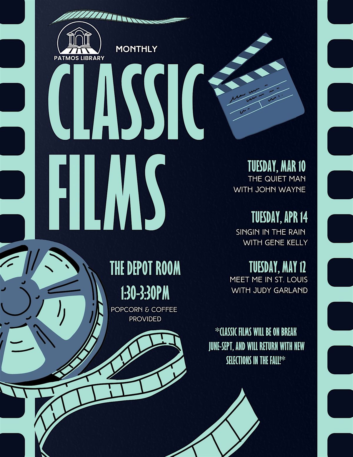Welcome film buffs! Join us for Classic Films @ The Patmos Library! Get ready to immerse yourself in the golden age of cinema with timeless classics on the big screen. Grab your popcorn and enjoy a trip down memory lane with iconic movies that have stood the test of time. Don't miss this unique opportunity to experience these cinematic masterpieces in a cozy setting - every second Tuesday of each month, starting March 10th at 1:30pm in the Depot Room. Popcorn and coffee provided! See you there!