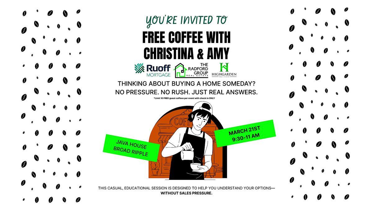 Join Christina Radford, local Broad Ripple real estate expert, and trusted lender Amy Robbins for another edition of Coffee & Chat, a relaxed, come-as-you-are conversation designed to give you clarity on homeownership.