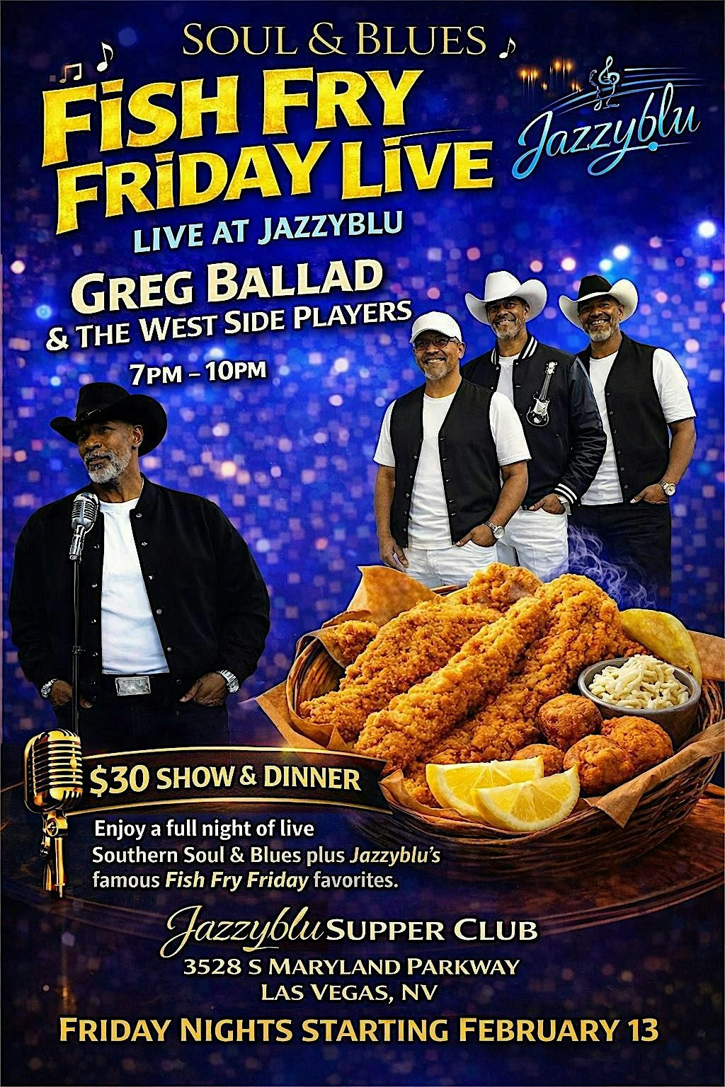 Join us at Jazzyblu Supper Club for a night of great food, music, and atmosphere. Your $30 admission includes your dinner and a taste of some Southern favorites.