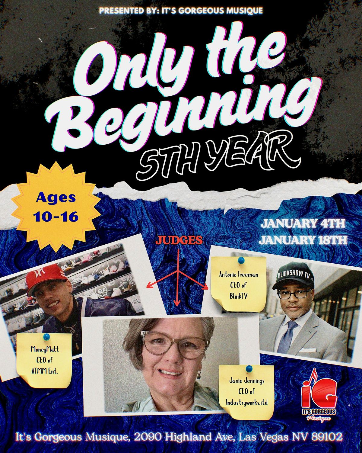A free 8-week course has been designed for the next generation of artists as It’s Gorgeous Musique expands opportunities and resources to talented kids in local communities in and around Las Vegas. Future artists ages 10-16 from some of Las Vegas’s most under-resourced communities are given the opportunity to create, perform and produce their own original music, through a series of 8 weekly workshops held onsite at It’s Gorgeous Musique. Participants are selected after responding to an open call for auditions (housed on Eventbrite) and judged by Las Vegas industry executives. The selected participants receive coaching and mentoring from some of the best music executives in the industry assisting them in reaching their artistic and professional goals.
