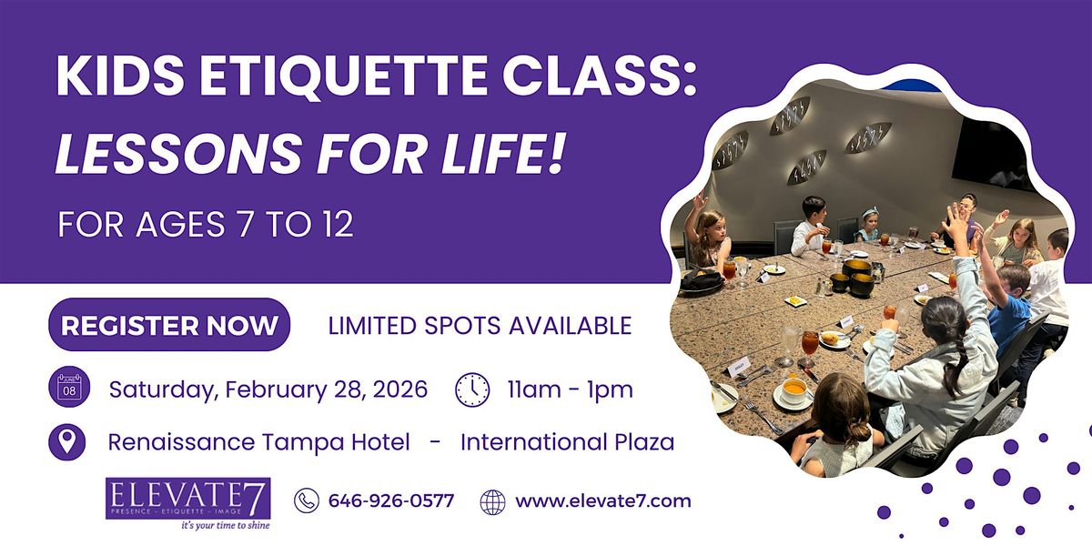 Parents, give your children the gift of social grace with our Kids Etiquette Class, led by Maria E. Campos, international etiquette expert, and designed for ages 7 to 12. In this engaging and interactive session, students will learn essential manners and polite behavior for real world settings, including basic dining etiquette and courteous social interactions practiced through fun, age appropriate scenarios.