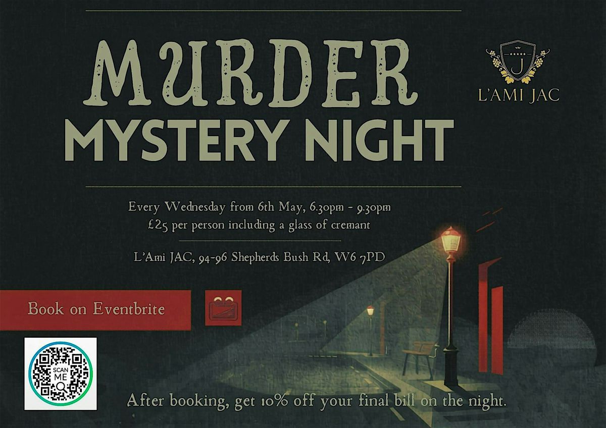 Join us every Wednesday at L'Ami JAC, Shepherds Bush, for an unforgettable evening of intrigue, roleplay, and great food and wine.