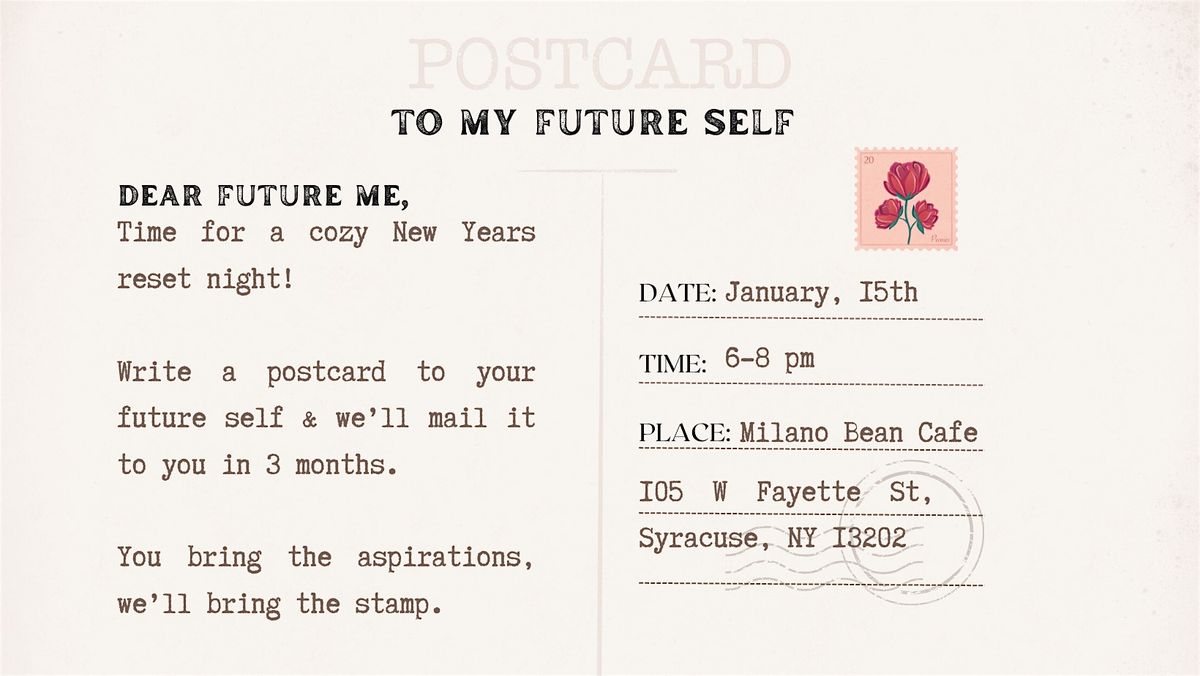 Join us for a cozy evening where you’ll write a postcard to your future self. We’ll hold onto it and mail it back to you in three months, when you’ve probably forgotten what January-you was hoping for.