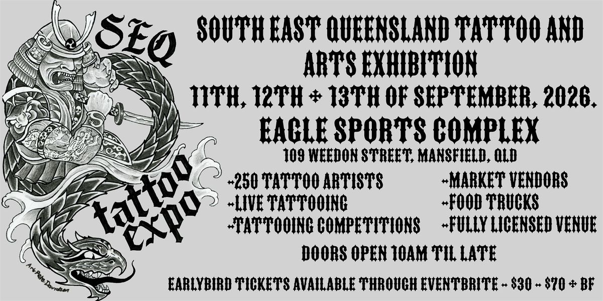 Welcome to the SOUTH EAST QUEENSLAND TATTOO AND ARTS EXHIBITION! Join us on Friday 11th, Saturday 12th and Sunday 13th September 2026 at EAGLES SPORTS COMPLEX at Mansfield, Brisbane, QLD. Get ready to be amazed by the talent of over 250 Local, Interstate and International Professional Tattoo Artists showcasing their skills. Whether you're a tattoo enthusiast or just appreciate beautiful art, this event is perfect for you. Don't miss out on this unique opportunity to experience the vibrant TATTOO and ART scene in South East Queensland.