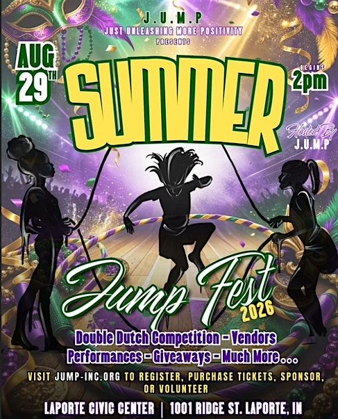 Come join us for our 2nd Annual JUMP Fest! Get ready for an exciting Double Dutch Competition, Dance Performances, Give-A-Ways, Local Food Vendors, Community Resource Vendors, Small Business' and more. This is an event you don't want to miss. The J.U.M.P Fest has something for everyone! Mark your calendars and get ready to have a blast with us!