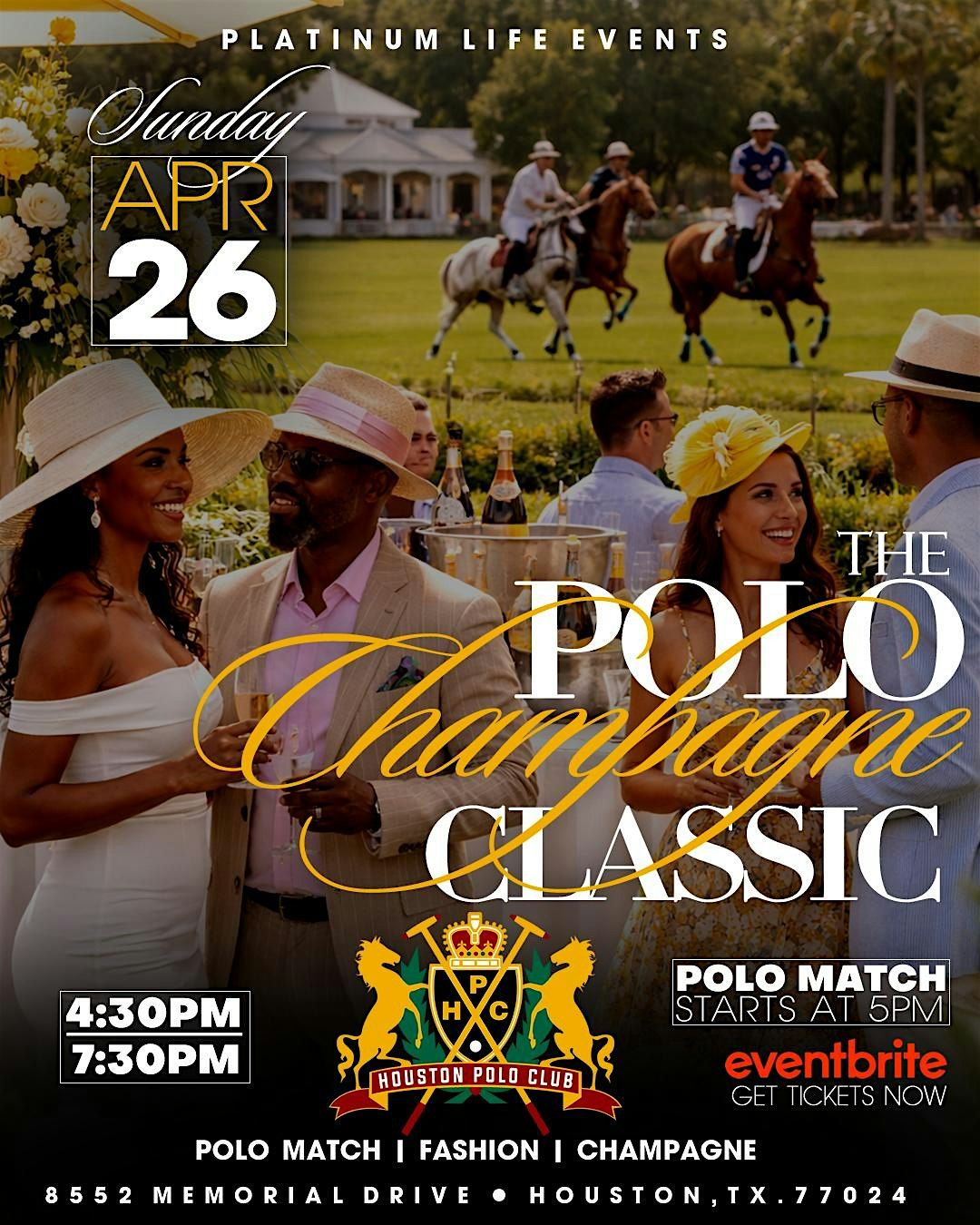 Mark your calendars for Sunday, April 26 and join us at the prestigious Houston Polo Club for an event like no other. From 4:30 PM to 7:30 PM, witness the thrill of a world-class polo match while indulging in complimentary champagne and delectable lite bites.