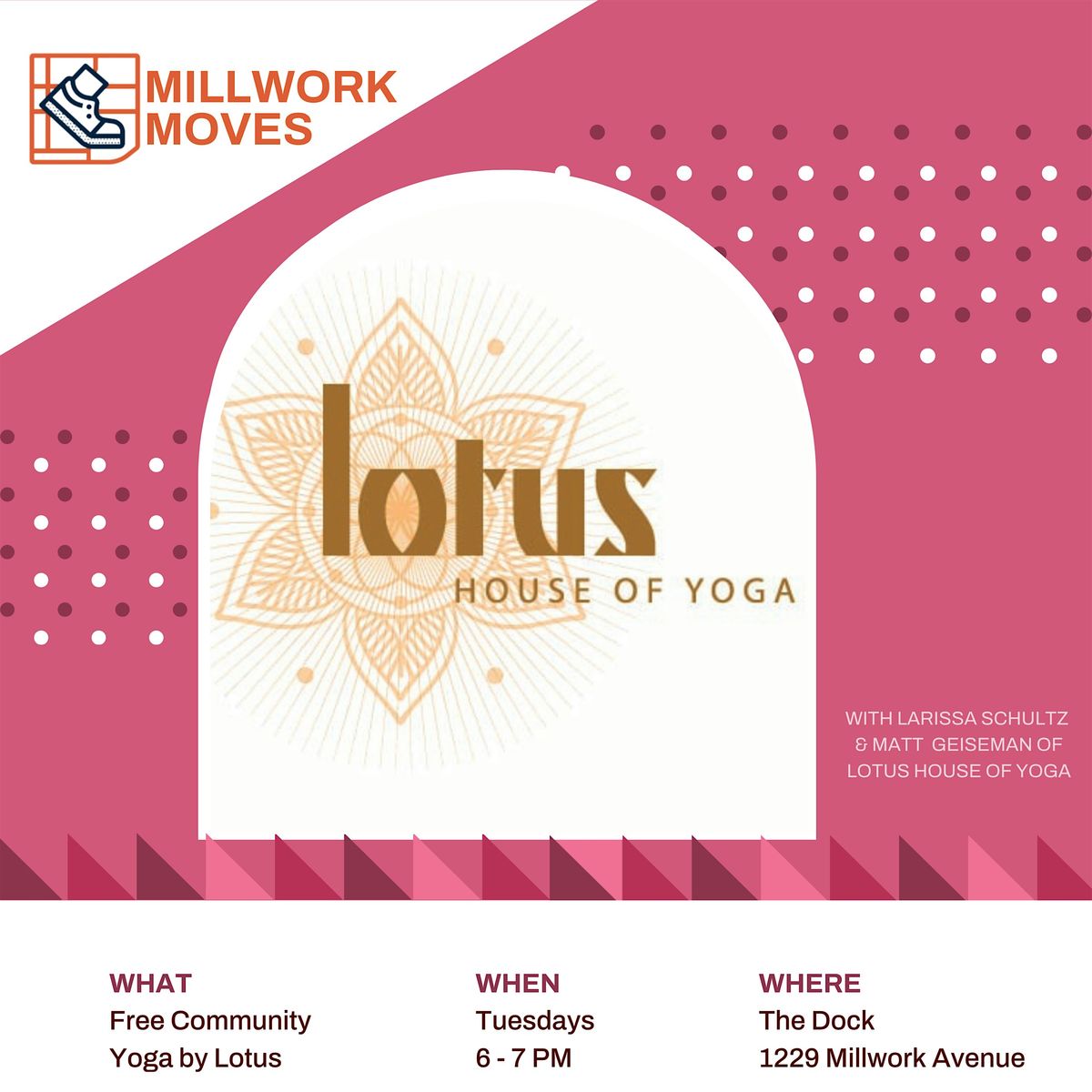 Free, community yoga in the Dock of The Ashton at Millwork Commons. Taught regularly by Larissa Schultz and Matt Geiseman on the first Tuesday of each month, a certified yoga instructor from Lotus House of Yoga! Simply bring a mat, a water bottle, and show up to enjoy flowing movement with community.