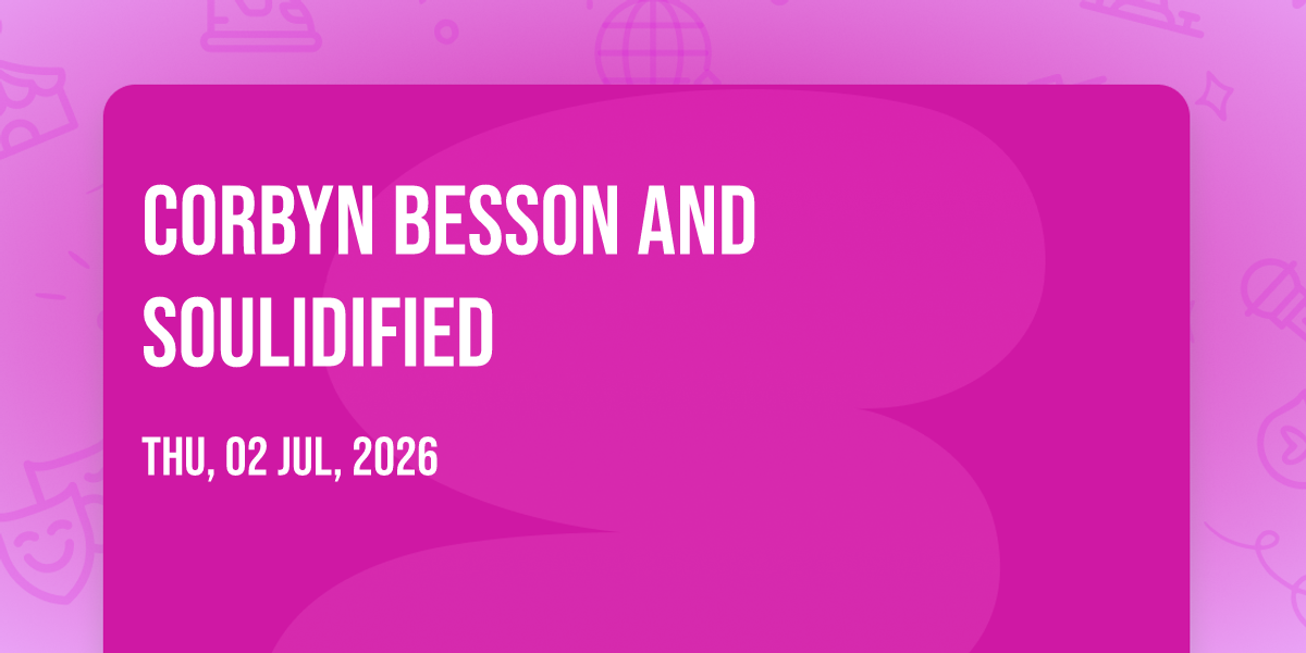 π Location: 38.9973, -77.0274π Welcome to Corbyn Besson and Soulidified, where dreams come alive and possibilities are endless! ποΈ Join us at The Fillmore - Silver Spring in the heart of Silver Spring, MD for an event that defies expectations. π On July 2nd, 2026 at 12:00 AM, be part of something truly extraordinary as we bring together innovation, entertainment, and pure magic. β¨ Every aspect has been carefully designed to ensure an unforgettable experience for all our guests. Whether you're seeking adventure, inspiration, or simply a break from the ordinary, this event promises to deliver beyond your wildest dreams. π Prepare for a journey into the extraordinary!