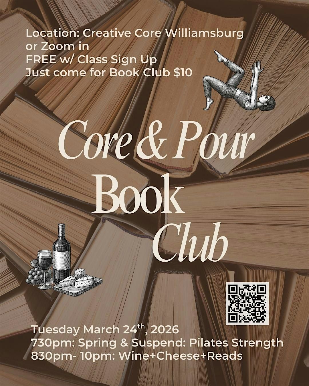 Join us for a fun-filled evening at Creative Core Pilates Williamsburg! Get ready to strengthen your core with a Spring & Suspend Pilates class, then unwind with community, wine and charcuterie, and pick your next book!