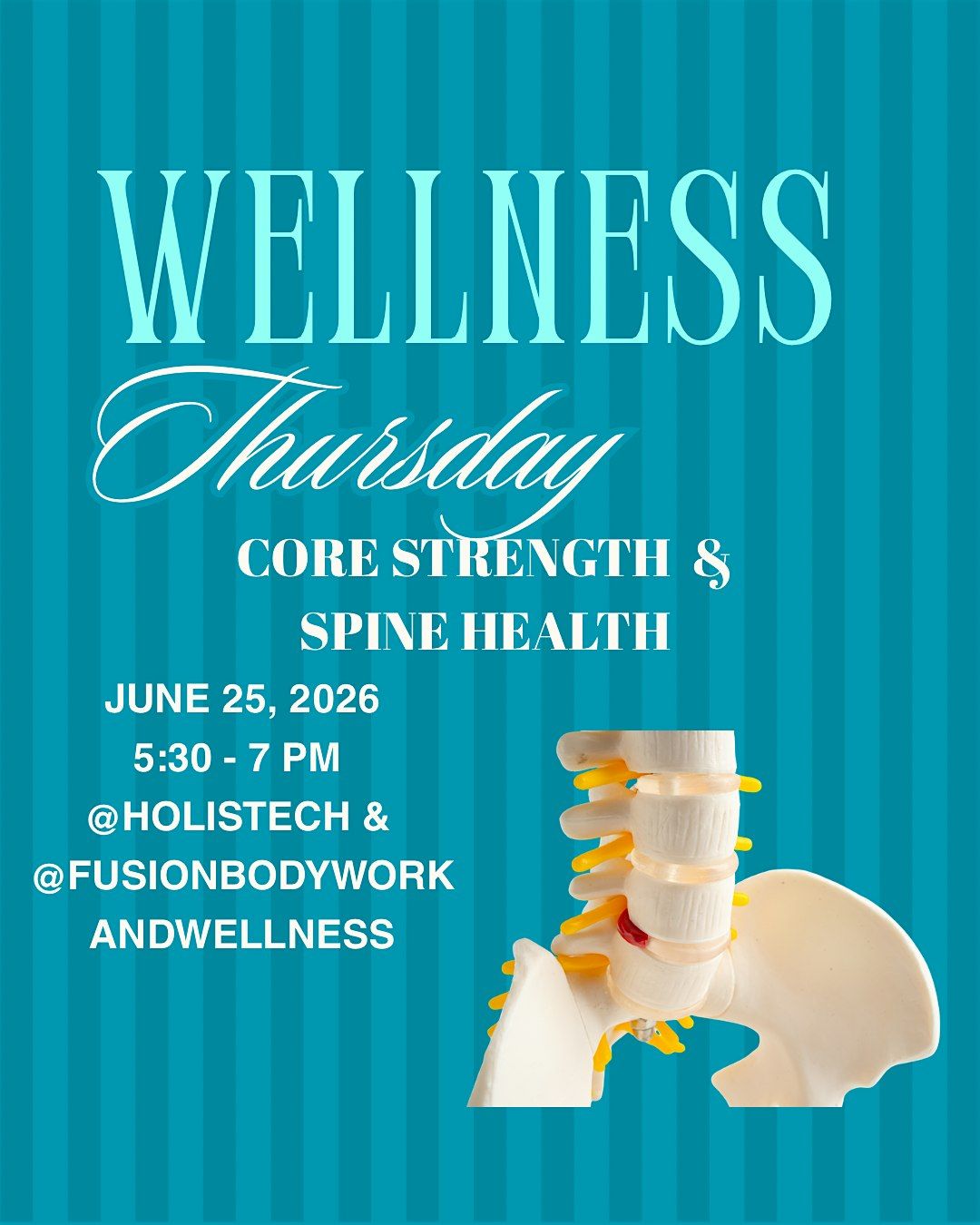 HolisTech Wellness Center and Fusion Bodywork and Wellness have joined forces for this exciting workshop. Up to 25 to 39% of the population experiences back pain, and it is reported that 80% experience some form of spinal pain at some point in their lives. Modern living has weakened spinal health. Learn how pilates, facial stretch therapy, Ayurveda, and biohacking therapies can help strengthen and support spinal health and recovery.