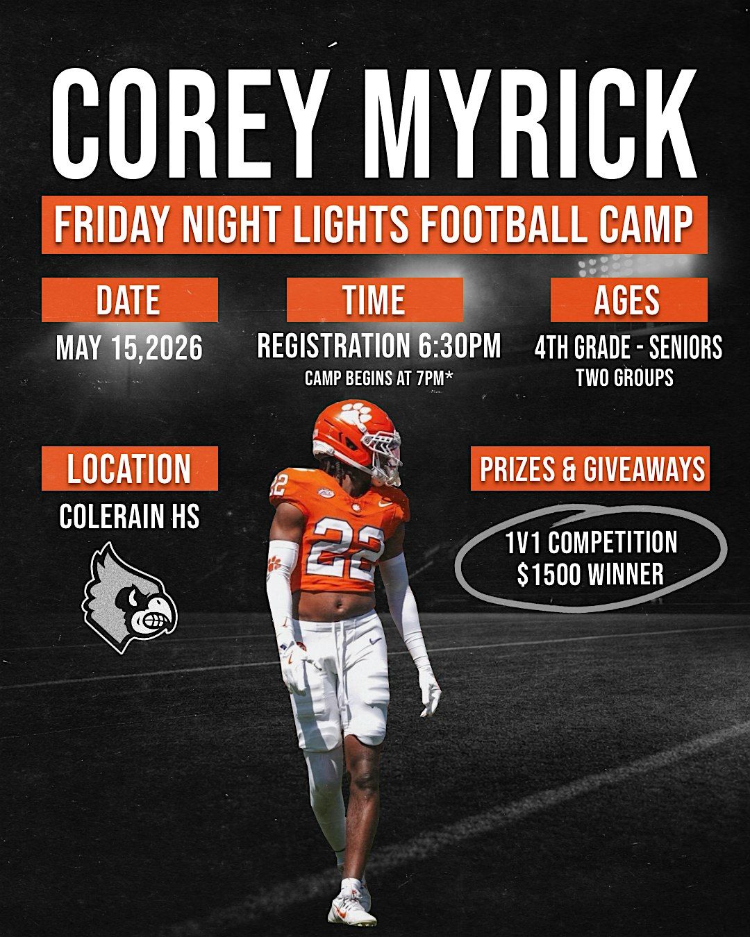 Join us for an exciting evening of football at the Corey Myrick Camp: Friday Night Lights! This camp, hosted by Corey Myrick, Class of '24, promises an engaging and educational experience for all participants. Held at Colerain High School, this free camp is designed to enhance skills, build teamwork, and have fun under the lights.