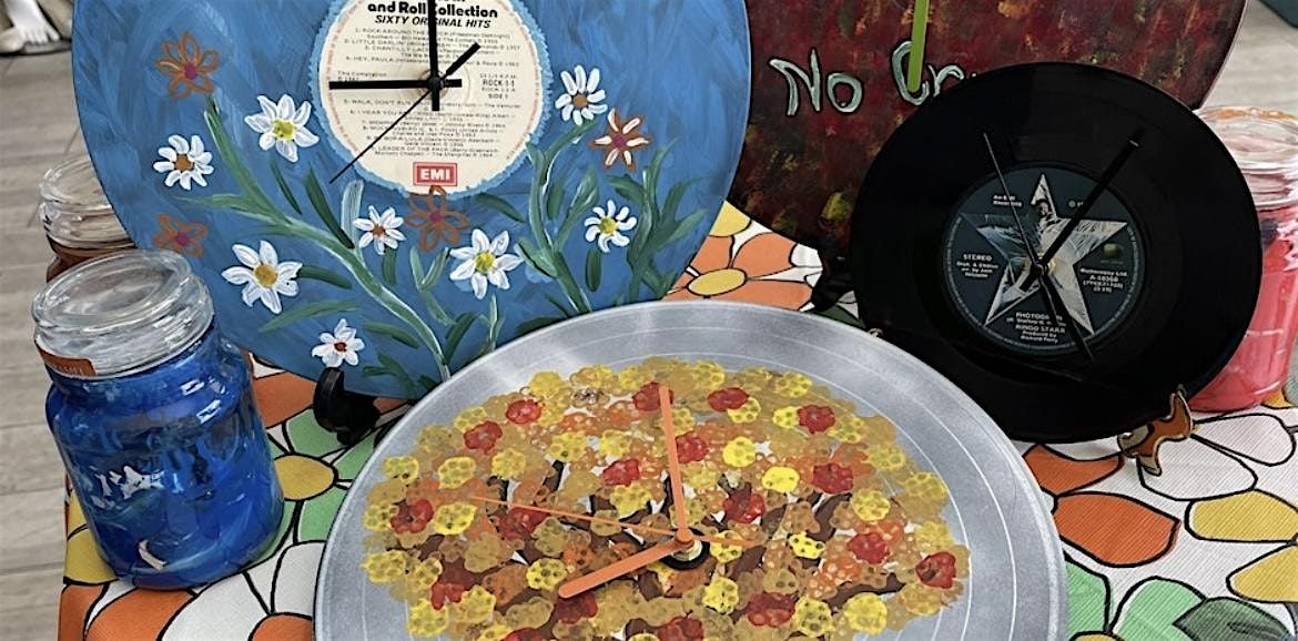 Using upcycled materials you will create a unique work of art using a vinyl as a canvas. Once complete this upcycled piece with double as a functioning clock for your home.