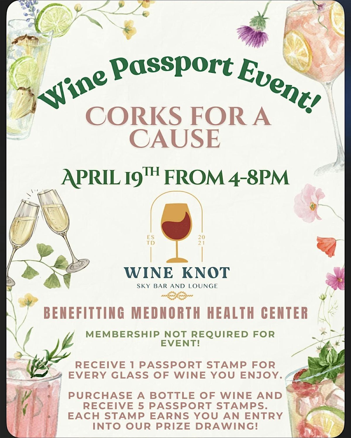 Join us on April 19th from 4–8 PM for an interactive wine experience where every glass earns you passport stamps—and a chance to win exciting prizes. No membership required, and all proceeds benefit MedNorth Health Center. Cheers to doing good while drinking well!