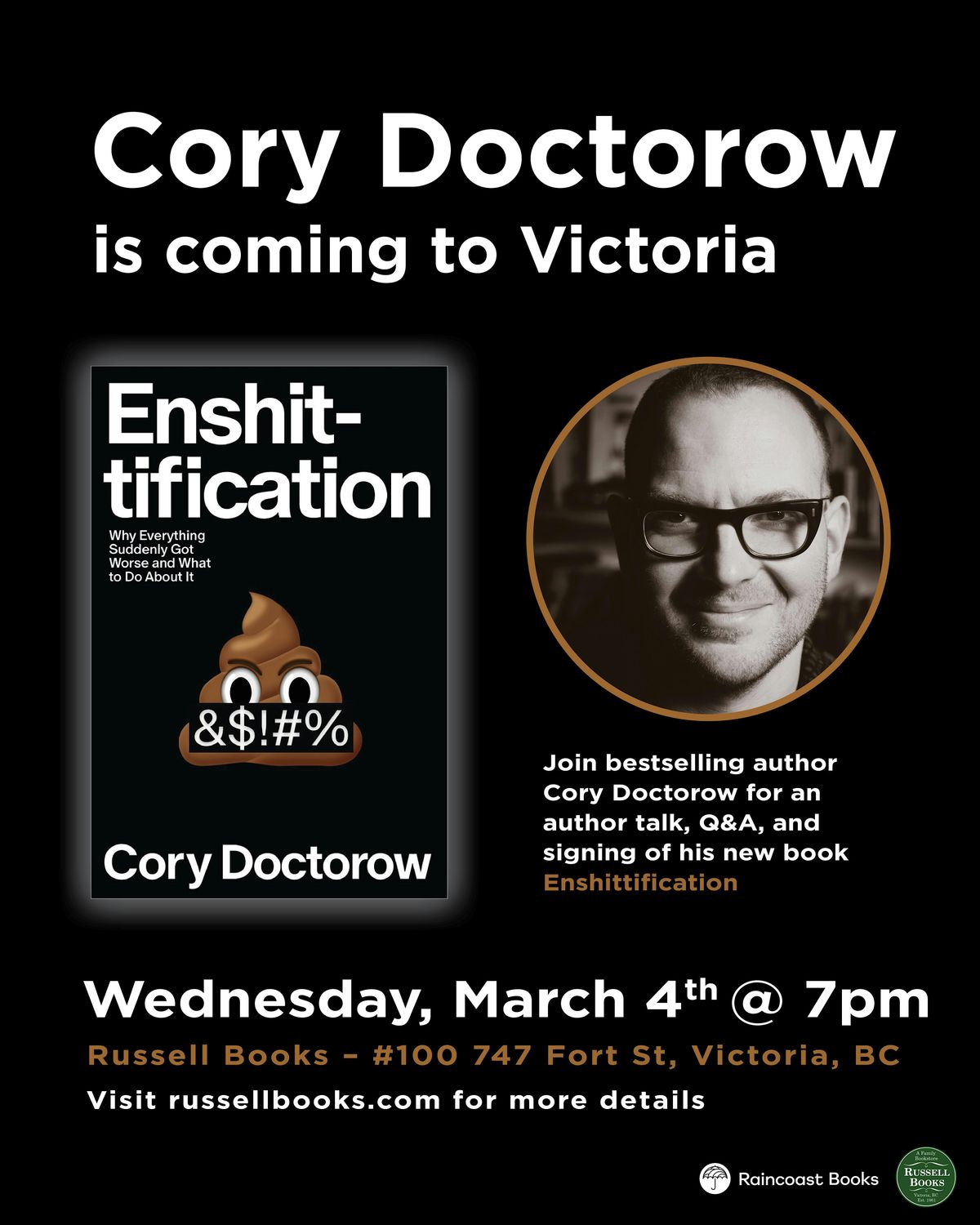 About the author: Cory Doctorow (craphound.com) is a science fiction author, activist, and journalist. He is the author of dozens of books including ENSHITTIFICATION and the novels PICKS AND SHOVELS (a followup to RED TEAM BLUES). Other notable books include the solarpunk novels WALKAWAY and THE LOST CAUSE; the tech policy books THE INTERNET CON and CHOKEPOINT CAPITALISM; and the internationally bestselling YA LITTLE BROTHER series. His next book is THE REVERSE CENTAUR’S GUIDE TO LIFE AFTER AI (June 2026).