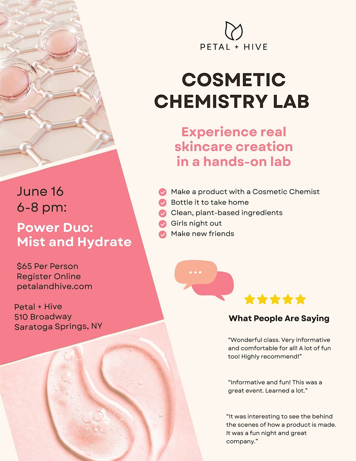 At the end of the workshop, we’ll bottle the product together—and you’ll take home a full-size skincare product to use in your own routine.
