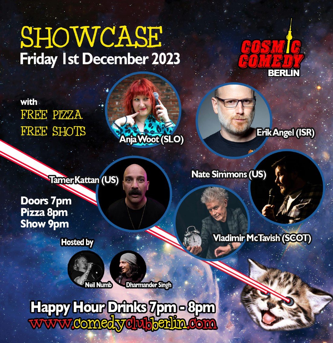 Join us for Cosmic Comedy Club Berlin at our brand new venue and as always every show with Free Vegan and Vegetarian Pizza & Shots