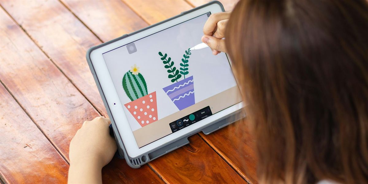 Image: A young person drawing colourful pot plants on an iPad