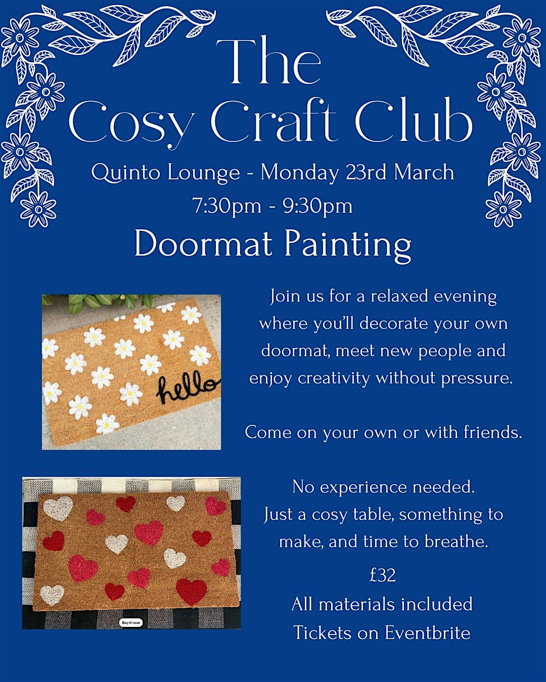 Join us for a fun, in-person creative session at the Cosy Craft Club! Get your hands messy as we design and paint one-of-a-kind doormats that add a personal touch to your home. Perfect for beginners and craft lovers alike. Bring your creativity and let’s make something wonderful together!
