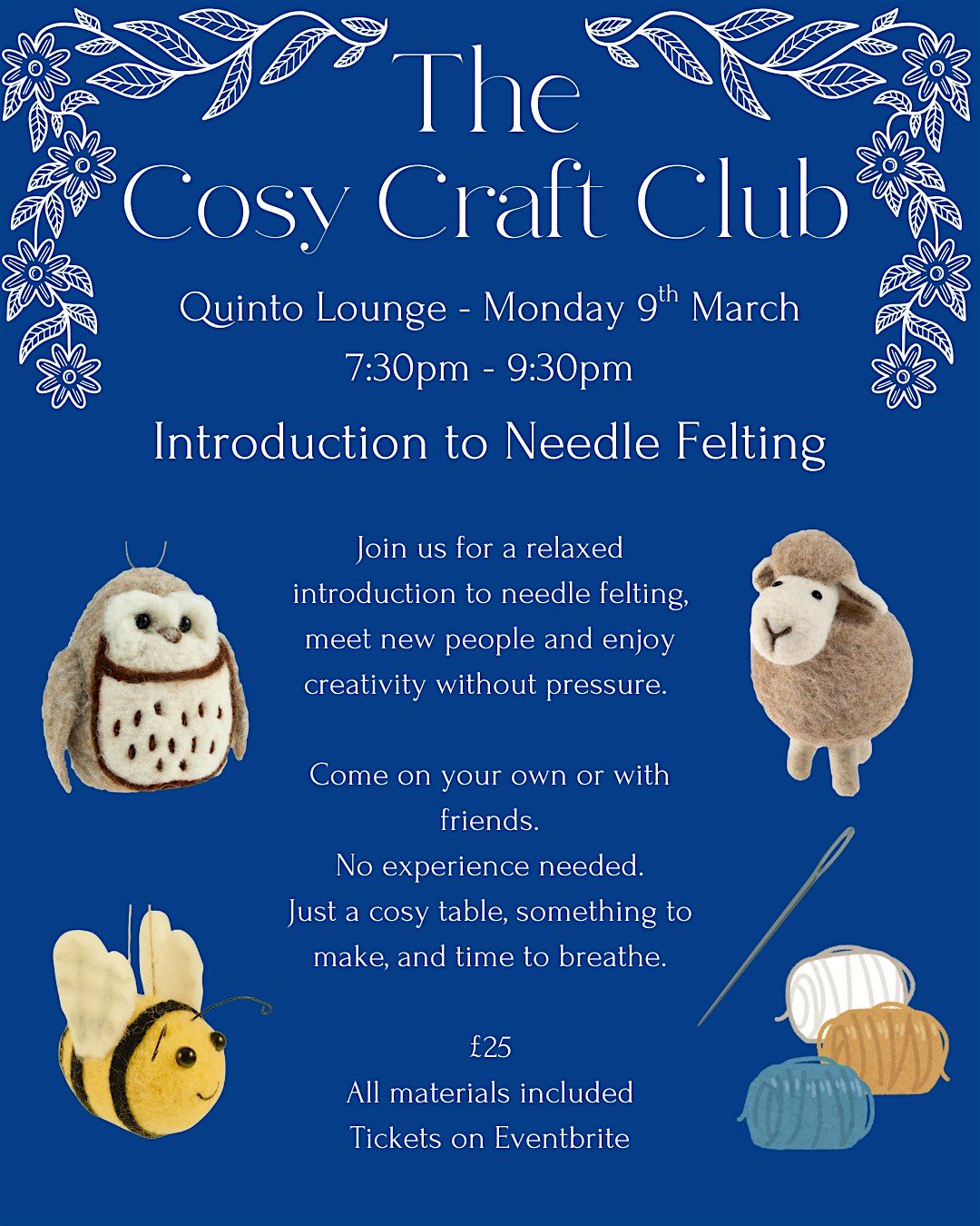Needle felting is relaxing, beginner friendly and a lovely craft to create with friends or loved ones. You will be guided through the process with as much or little help as you need.