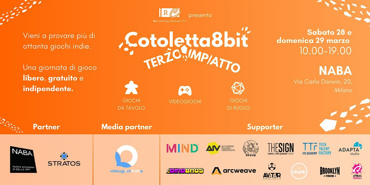 Cotoletta8bit è la festa milanese del gioco indipendente. Qui ci si ritrova per giocare e mangiare, ma anche per parlare e ascoltare di giochi, arte e intrattenimento con un particolare focus sulle autoproduzioni e sulla creatività diffusa. Sei nel posto giusto se ti incuriosisce o ti appassiona giocare, se sei un professionista o un amatore che i giochi li crea, se credi nella contaminazione di idee, o se semplicemente vuoi scoprire 90 nuovi videogiochi, giochi da tavolo e giochi di ruolo indipendenti.