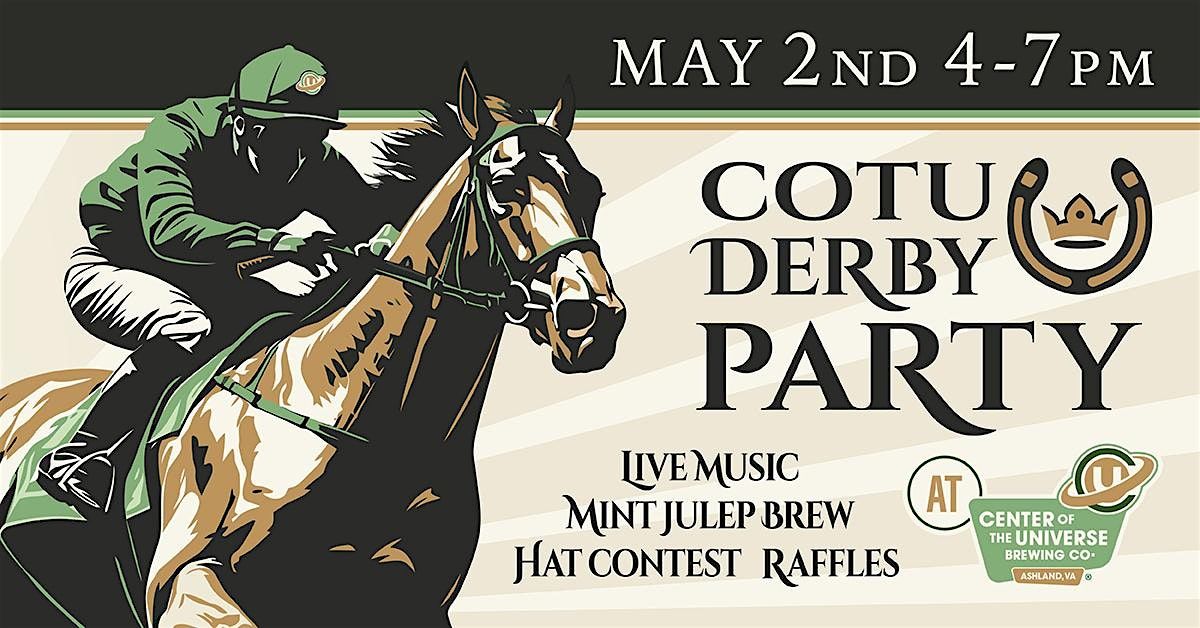 Join us at Center of the Universe for the return of our annual Derby Party! Enjoy live music leading up to the big race, as well as food trucks, a Derby Hat contest, and raffles! To go along with all the action, try out our limited addition Mint Julep brew, or any other COTU beer, wine, sparkling wine, cider, or non-alcoholic beverage. Then, catch all the live action on our indoor big screen to see who will take this year's crown! Free to attend and open to all ages.