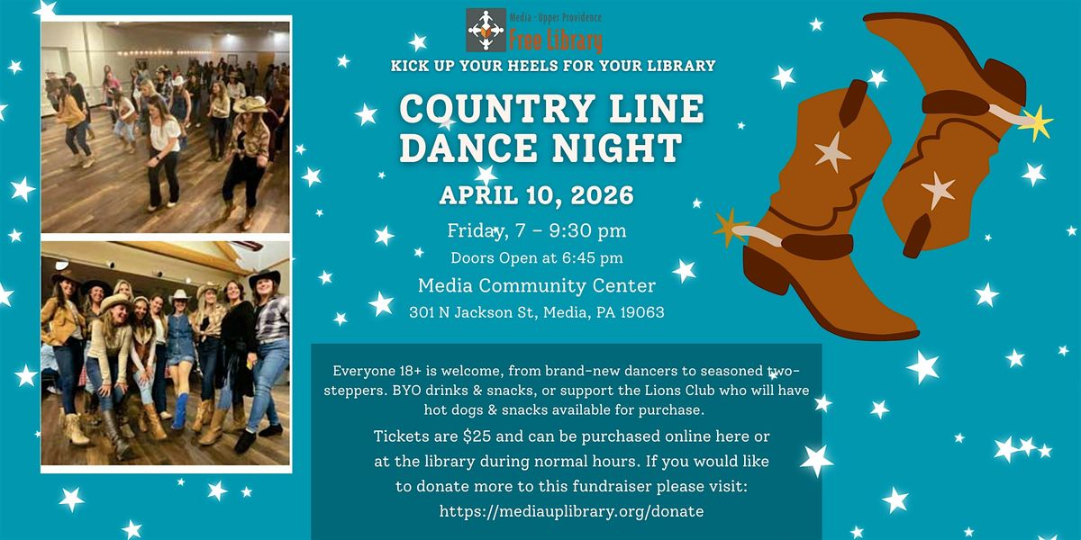 Everyone 18+ is welcome, from brand-new dancers to seasoned two-steppers! Tickets are $25 and can be purchased online here or at the Library during normal hours. If you would like to donate more to this fundraiser visit:https://mediauplibrary.org/donate.