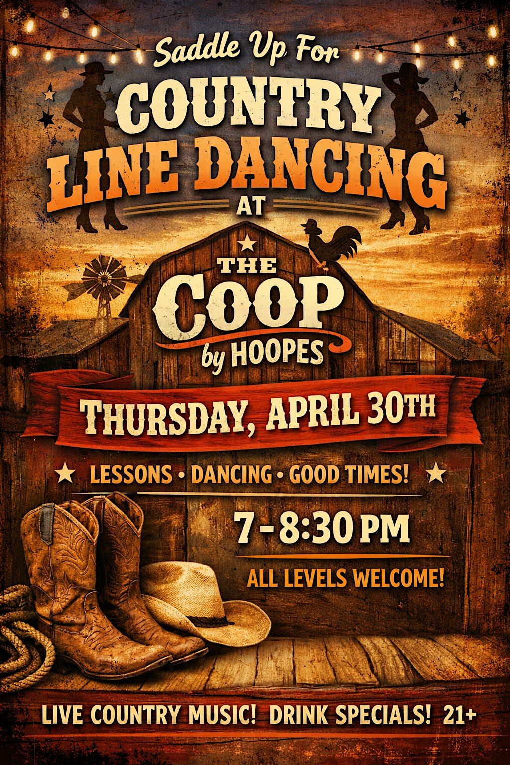 Kick up your boots and join us for some fun country line dancing with Hoopes!