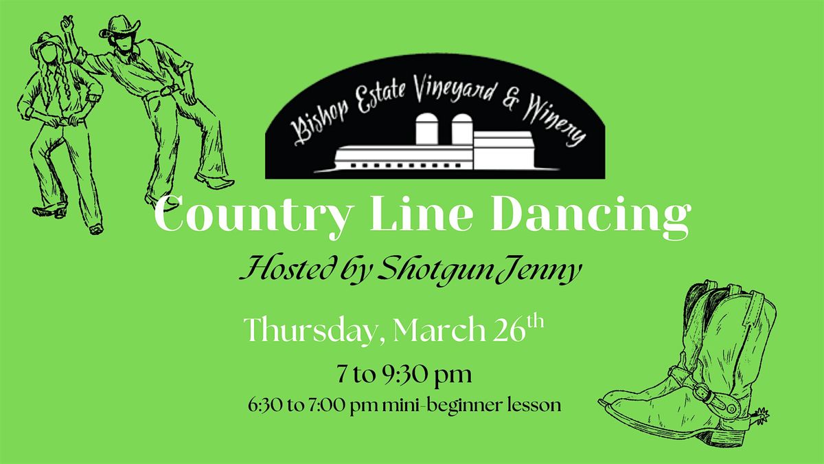 Come join us for a night of country line dancing with the one and only Shotgun Jenny at Bishop Estate Vineyard and Winery! Get ready to kick up your heels and dance the night away to some awesome country tunes. Whether you're a seasoned pro or a beginner, everyone is welcome to join in on the fun.