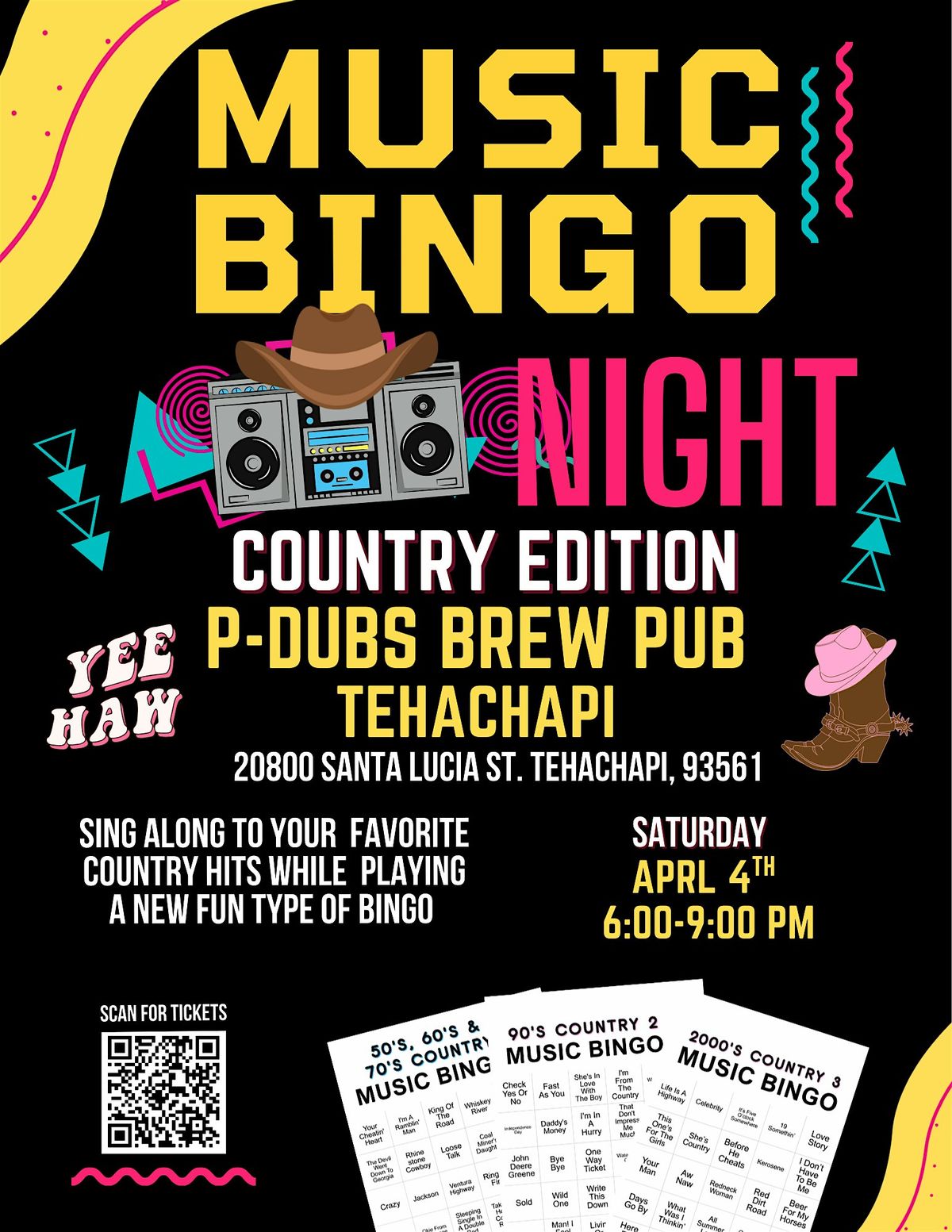 Hey Music Bingoers! Country Music Bingo Night is coming back to Tehachapi! April 4th at 6 pm we will be at P-Dubs in Tehachapi.