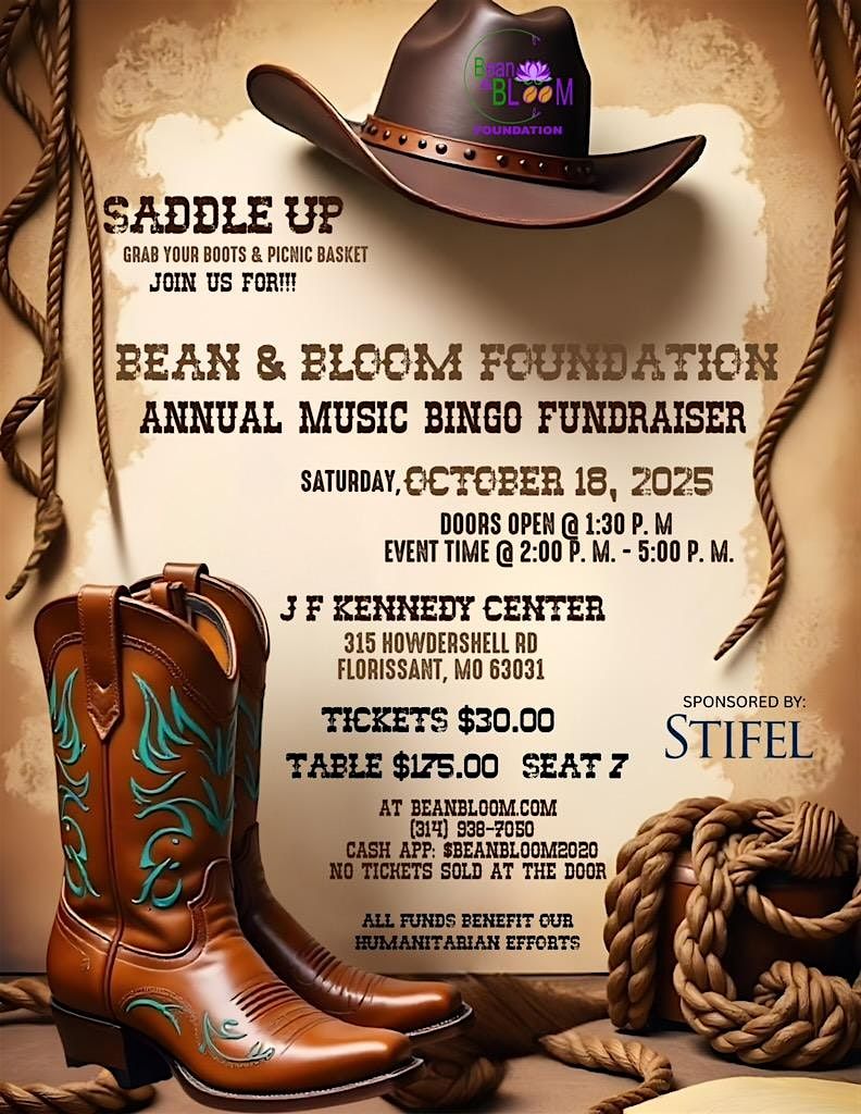 Come join us for a fun aft of Country Western Music Bingo at the J F KENNEDY CENTER! Get ready to test your music knowledge and win some awesome prizes while enjoying your favorite tunes. Bring your friends and family for a boot-scootin' good time. Dust off those cowboy boots and get ready to yell "Bingo" to your favorite hits. Don't miss out on this toe-tappin' event, hosted by Bean & Bloom Foundation.