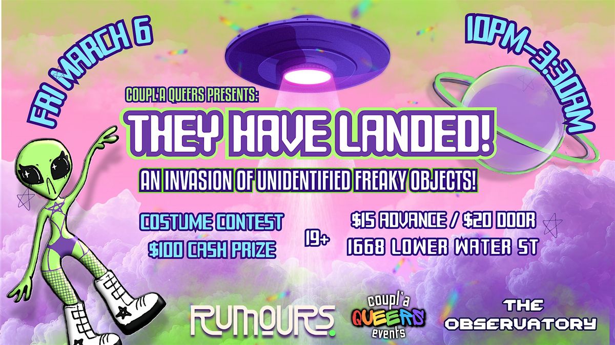 Breaking news: They have landed! Unidentified freaky objects are INVADING Rumours Cabaret on March 6! We have observed the behavior of these creatures and determined that they are attracted to flashy neon colours, the rumble of bass music, and dancing with one another in large groups with no particular sexual preference... They are here, they're queer, and Area 51 is nowhere near... So let's show them how we party here on the East coast 🎉 👽 You can choose to dress up to fit in with our newly found Freaks or come as you are, and the best costume will win a $100 CASH prize! (you know how Coupl'a Queers goes)