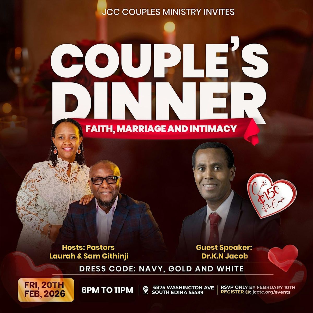 This special dinner experience invites couples to slow down, connect deeply, and reflect on the beauty of marriage as God intended it—rooted in faith, strengthened by commitment, and enriched through intimacy. Through meaningful moments, heartfelt conversation, and a welcoming atmosphere, couples will be encouraged to grow closer to one another while keeping God at the center of their union.