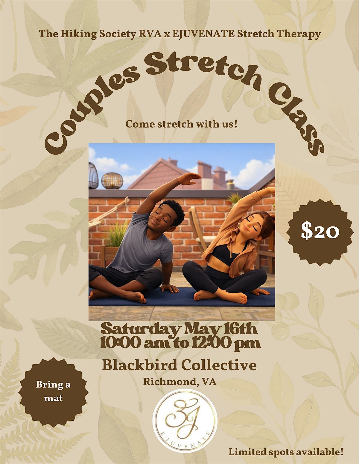 Join The Hiking Society RVA for a one-of-a-kind wellness experience. We’re bringing the community together for an unforgettable class led by Ericka J, certified stretch therapist and founder of EJuvenate. Ericka will guide couples through a personalized stretch session focused on improving mobility, releasing tension, and restoring balance in the body.