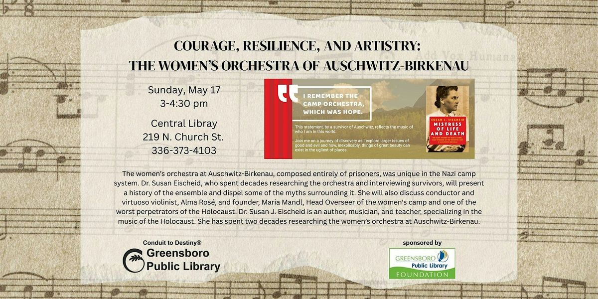 The women’s orchestra at Auschwitz-Birkenau, composed entirely of prisoners, was unique in the Nazi camp system. Dr. Susan Eischeid, who spent decades researching the orchestra and interviewing survivors, will present a history of the ensemble and dispel some of the myths surrounding it. She will also discuss conductor and virtuoso violinist, Alma Rosé, and founder, Maria Mandl, Head Overseer of the women's camp and one of the worst perpetrators of the Holocaust.