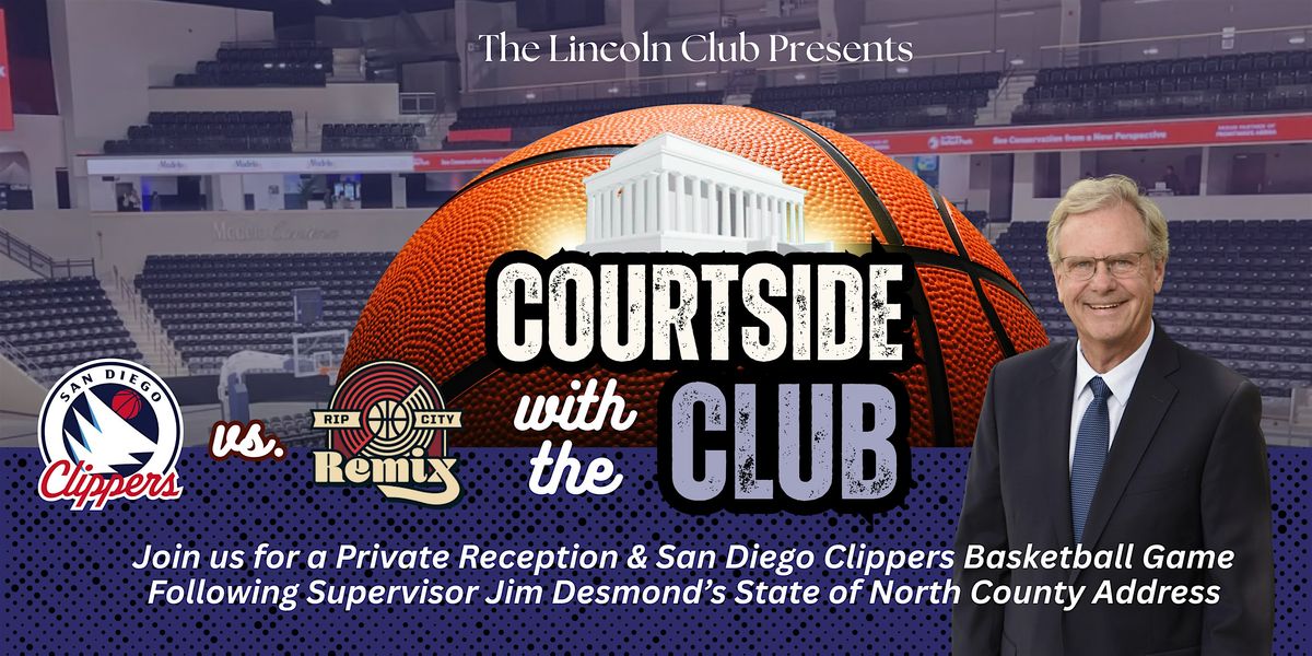 Join fellow Lincoln Club members for an exclusive private reception on the deck at Frontwave Arena to watch the San Diego Clippers take on the Rip City Remix. This members-only evening includes refreshments, admission to the basketball game, and entry to Supervisor Jim Desmond’s State of North County Address.