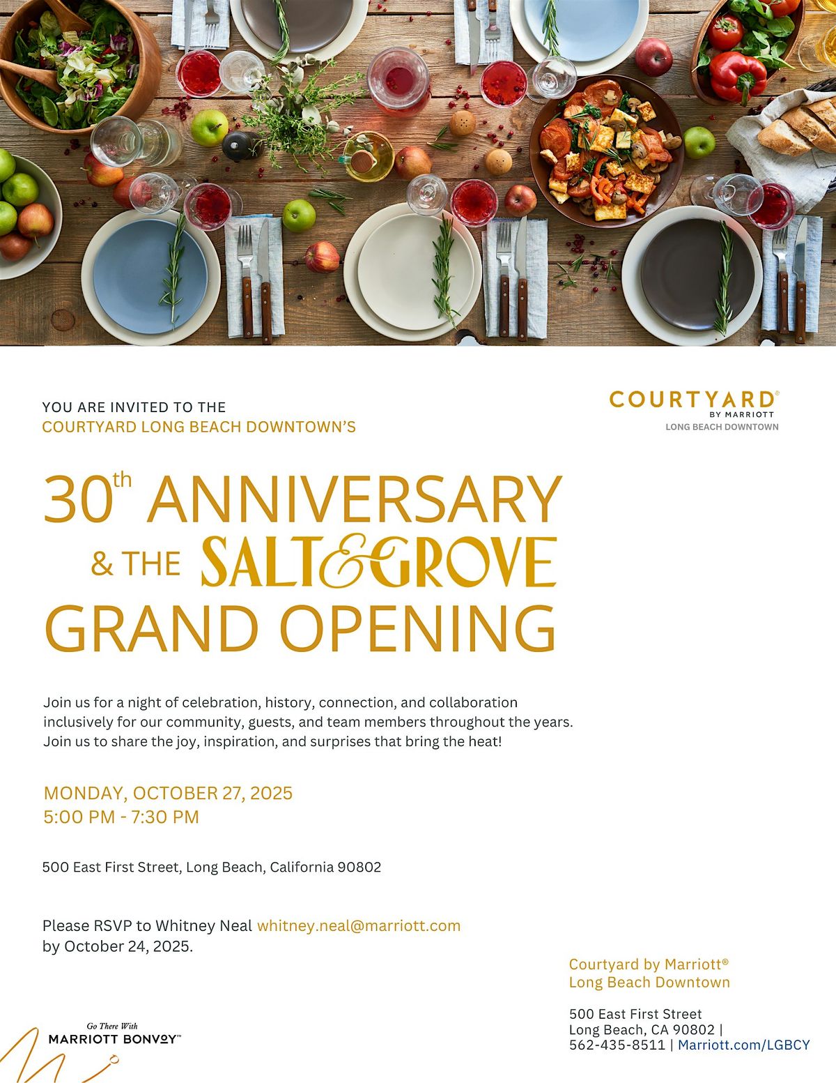 Welcome to the Courtyard Long Beach Downtown 30th Anniversary celebration and the grand opening of Salt & Grove! Join us at the Courtyard by Marriott Long Beach Downtown for a day filled with fun, food, and festivities. Come celebrate three decades of hospitality with us and be among the first to experience the newest addition to our hotel. Don't miss out on this special event!