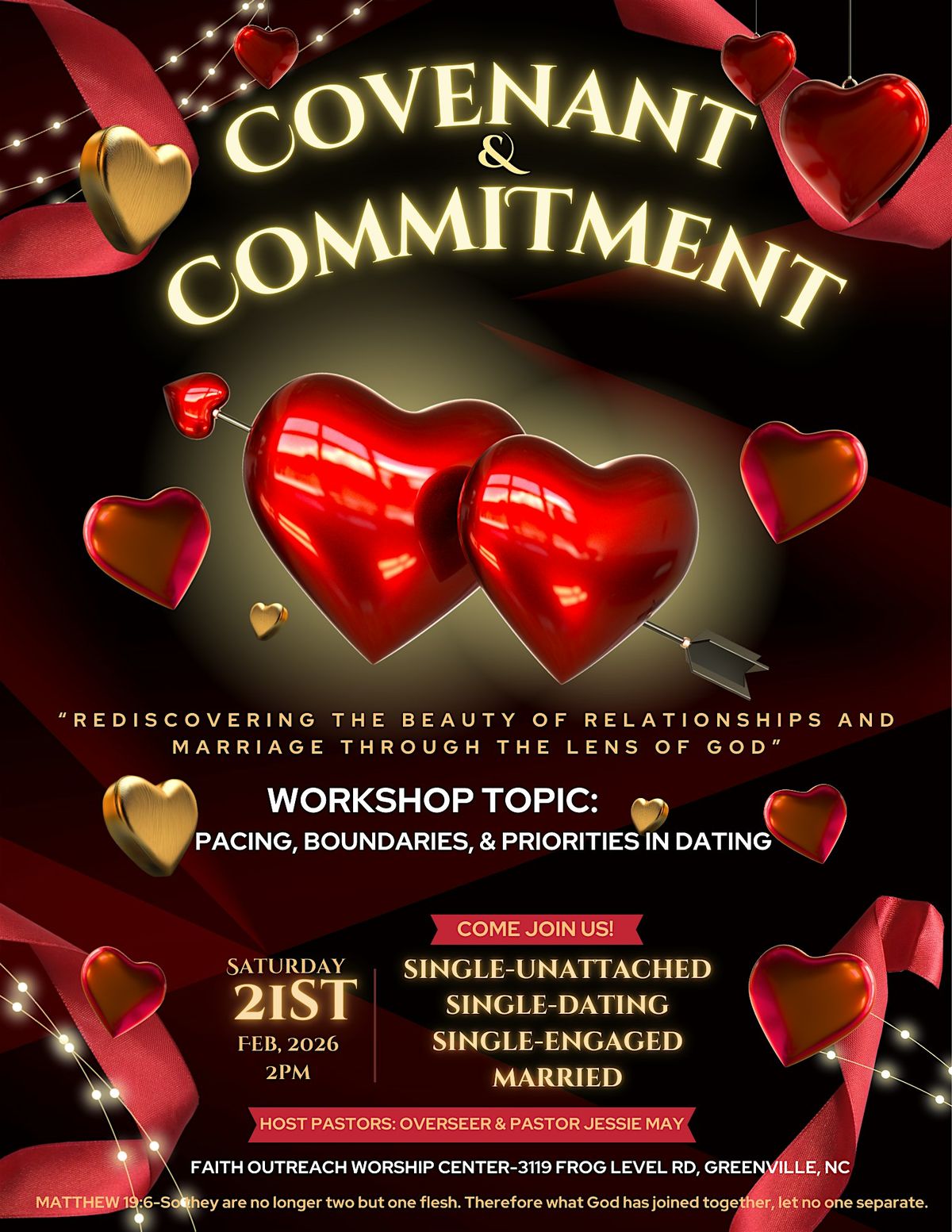 Covenant and Commitment is a powerful workshop series designed to spark real, faith-filled conversations about relationships. Featuring dynamic panel discussions with both men and women, this experience helps participants grow at every stage of relationships—single, dating, engaged, or married—by learning how to make God-centered decisions rooted in His principles. Come ready to listen, learn, and be challenged to build relationships that honor God and last.