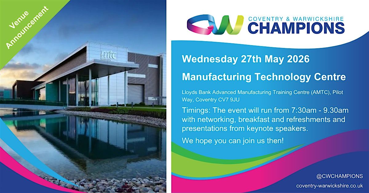 Coventry & Warwickshire Champions is back with another exciting networking event at Coventry University Technology Park. Join us for a morning of inspiring keynote speakers, valuable networking opportunities, and great conversations with business leaders and professionals from across the region.