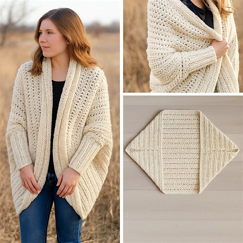 - With a few gentle folds and simple seams, your square transforms into a wearable cocoon cardigan.