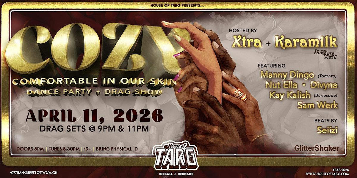 On Saturday, April 11th, its time to get COZY. Celebrate black artistry and feel comfortable in your skin with a fierce dance party and drag show at House of Targ, hosted by Xtra and Karamilk (from Canada's Drag Race Season 6)! Experience drag and burlesque performances by local Ottawa talent and beyond while shaking your groove thang to a mix of Black music from ballroom anthems to Afrobeat grooves!