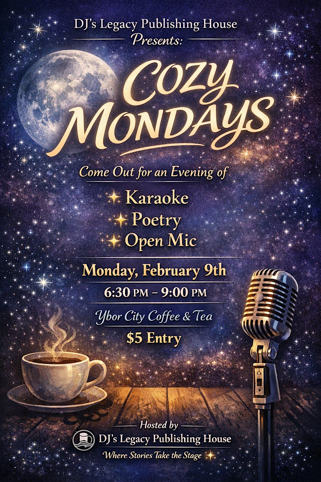 Unwind, connect, and create at Cozy Mondays, a warm and welcoming open mic night hosted by DJ’s Legacy Publishing House. Join us for an evening of karaoke, poetry, and open mic performances in the heart of Ybor City. Whether you’re performing or just enjoying the vibes, this is the perfect way to start your week creatively