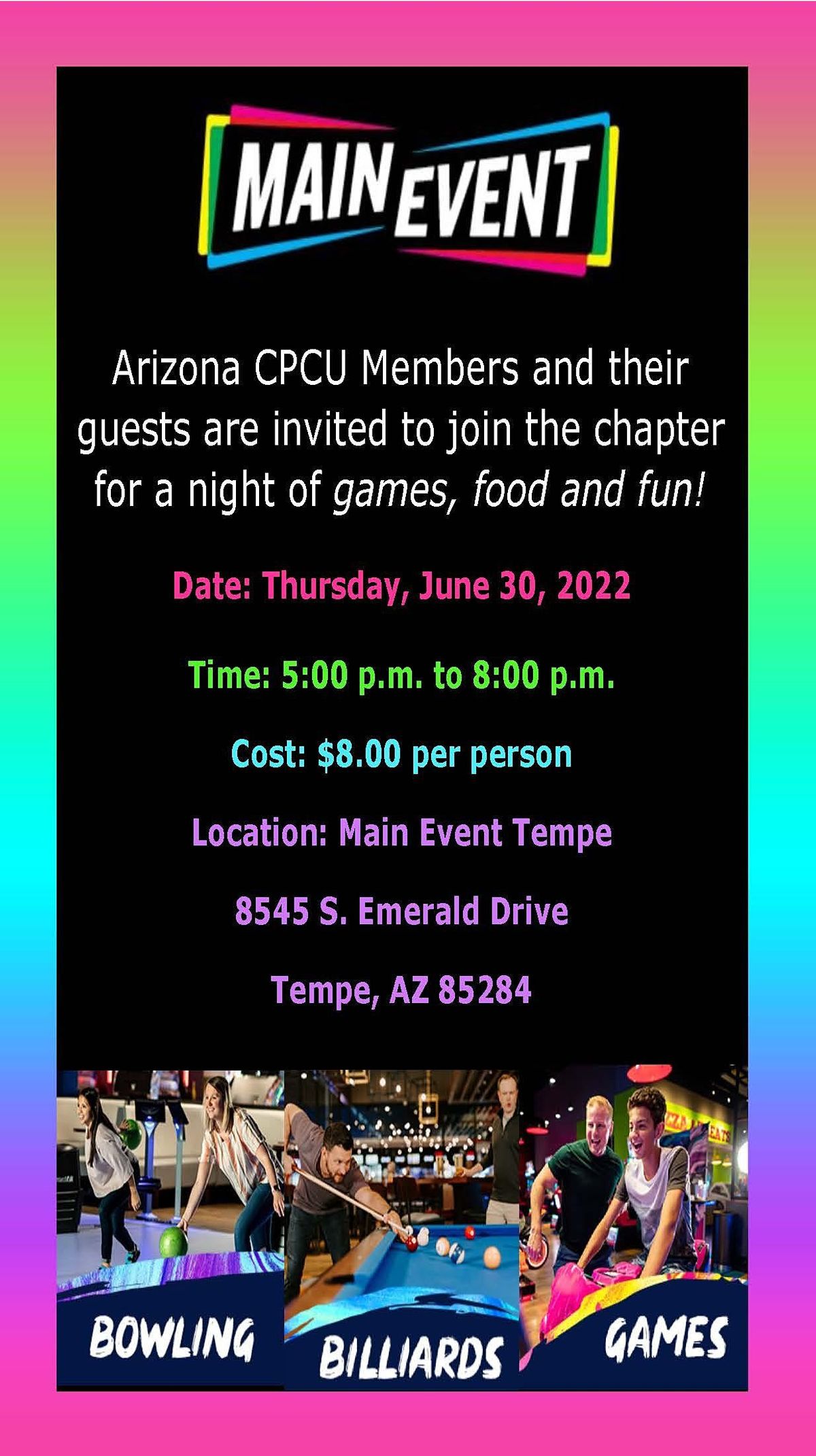 Join the Arizona CPCU Society Chapter on Thursday, June 30th from 5 - 8 pm at Main Event on 8545 S. Emerald Drive, Tempe, Arizona 85284 for food, fun, games and an opportunity to connect with your local CPCU peers!