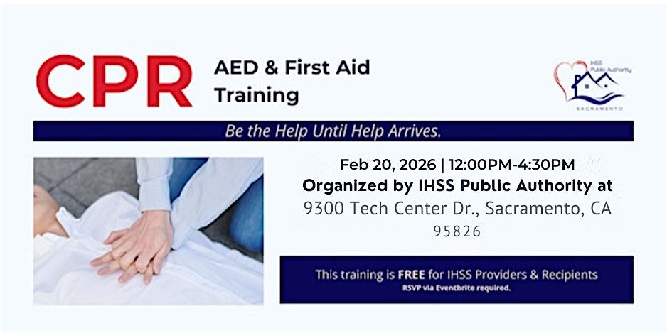 Join us for an informative and hands-on CPR AED & First Aid Training session! This in-person event will be held at 9300 Tech Center Dr.- Suite 100. Learn life-saving skills from certified instructors in a friendly and interactive environment. Whether you're a complete beginner or need a refresher, this training is perfect for everyone. Don't miss this opportunity to gain essential knowledge and confidence in handling emergencies. This training is FREE for IHSS Providers & Recipients. Sign up now!
